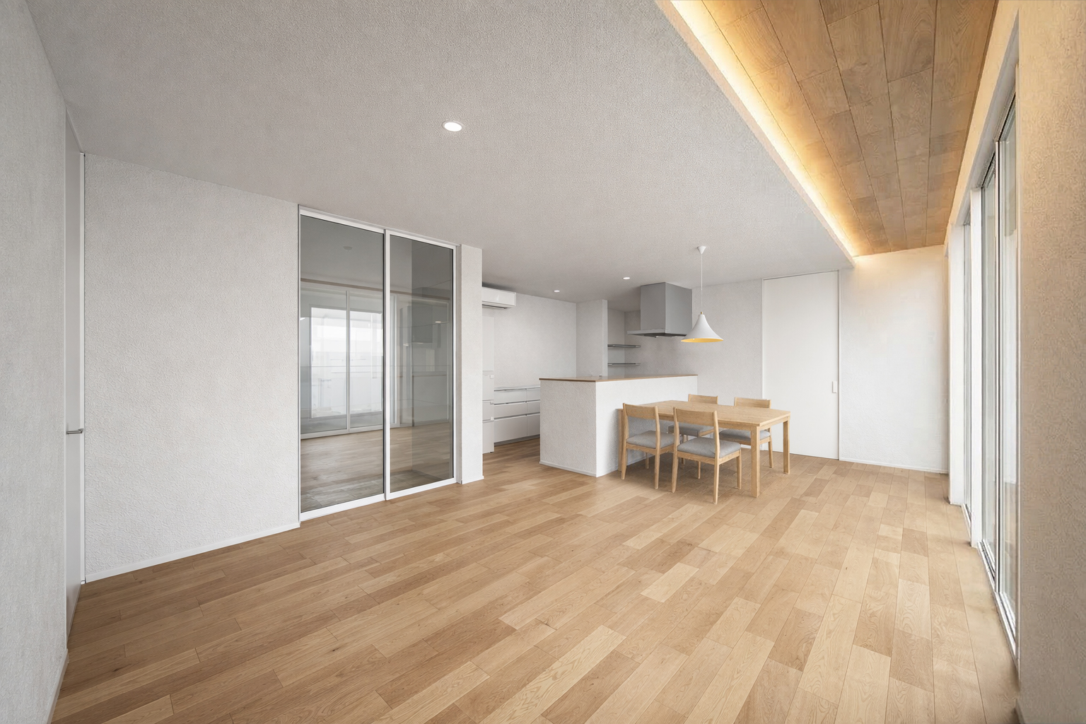 オークの床材がやわらかな光を受け止め、光が空間の表情をつくり出します。